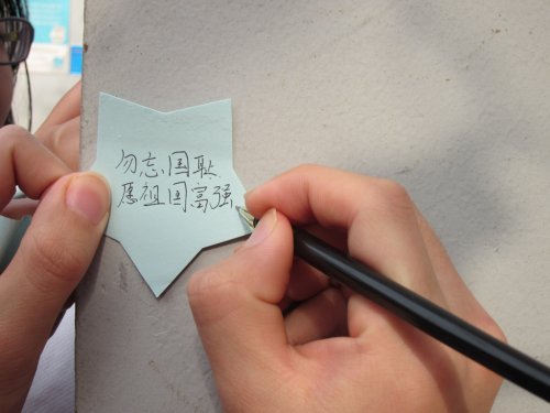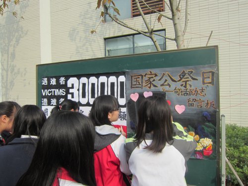 为郑重迎接本次国家公祭日的到来,学校于近期开展了一系列相关活动。11月下旬,学校团委积极响应团市委、市教育局关于国家公祭日主题教育活动的号召,在学校发起了“勿忘国耻、圆梦中国”主题征文、诗词楹联征集活动。三个校区的160多篇征文表达了同学们对这段惨绝人寰历史的铭记,对三十万死难同胞的深切缅怀以及对日益强大的祖国最美的祝福。此外,学生工作部、团委充分利用校园橱窗、宣传展板等再现了南京大屠杀的经过,并张贴了《南京市人民政府公告》和《国家公祭日鸣放警报期间机动车停驶鸣笛致哀交通安全提醒》。学校江宁校区在电子屏幕播放了《南京真相》纪录片,让同学们更为直接地了解历史。新街口、江宁校区校学生会干部们还组织了“国家公祭日,一句话励志”活动。同学们纷纷将自己对逝去者的缅怀之情、对国家的祝福写成一句句话贴在海报板上。