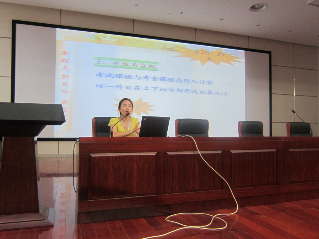 11日上午,学工部许鸣峰主任就《学生手册》的相关内容对学生进行了指导。他选取了《学生日常行为规范》、《考试纪律》、《住宿生管理暂行规定》、《操行评分制实施方案》、《处理条例》等重点要求,对学生进行了详细的说明。许主任最后告诫同学们:学习《学生手册》的目的在于“做最好的自己”,并祝愿同学们修身、立业、成人、成才。随后,教学科研部陈琴芳主任以《解读学籍规定,开启新起点》为题开展讲座。她用全新的视野从纵览财校学习生活、解读学籍规定、解读学籍规定、技能学习的引领、发展通道等五个方面对新生的学习生活进行了指导。下午1点10分,全体新生在各班教室进行了《学生手册》知识的考核。