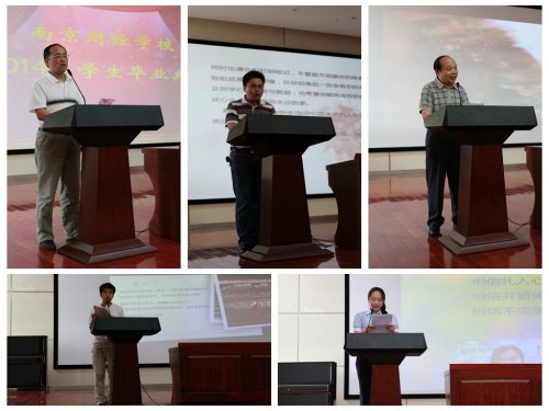 庄严的国歌之后,邓校长为2014届毕业生致辞。邓校长祝贺2009级高职和2011级中专的同学们顺利完成学业,并就“选择”提出了的几点建议与毕业生们共勉:选择是理性的,选择是要有底线的,选择是要负责任的。随后,毕业生代表信息技术系092班伏新和会计系1113班刘畅分别代表高职和中专学生发言。他们回顾了五年财校生活的点点滴滴,表达了对母校的谢意和对教师的感恩之情。接下来,教师代表金融系宋文新老师和家长代表会计系0910班陈斌同学的爸爸陈永福分别作了发言,对学生们顺利完成学业、走上工作岗位给予了各自的祝福。