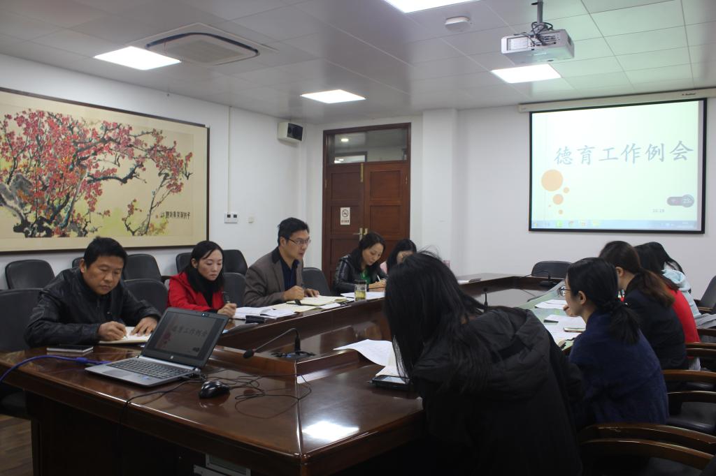 10月19日上午9点,城区德育主任例会在大会议室召开。学工部张学琴主任主持会议,陈浩副校长、黄荣桂副主任出席会议,各系德育主任及行政参会。