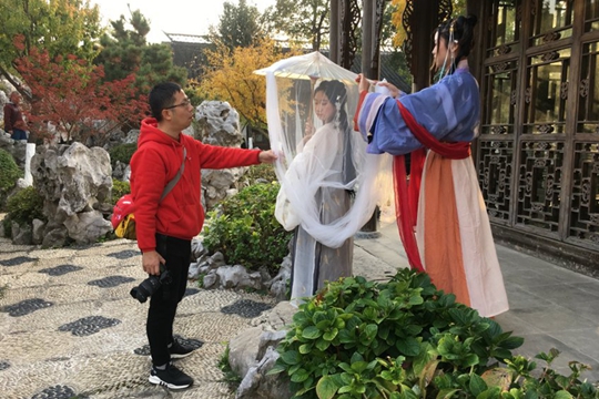 为了提高同学们对照片的审美感受能力以及摄影技能,11月24日下午,我校青藤映像社在老门西愚园举办了“寻汉唐——愚园古风拍摄”活动。活动邀请了溯古社的社员担任模特。周念东老师担任摄影指导。