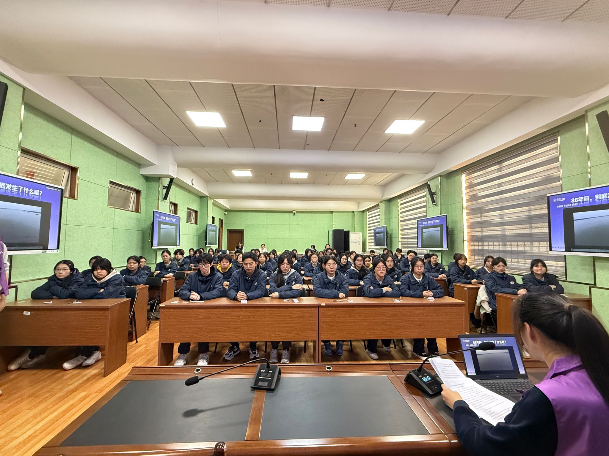 活动伊始,教室内肃穆庄严,防空警报声响起,全体师生静立默哀。宣讲人以“你是否听过这段声音?”为引,回顾南京每年9月18日与12月13日鸣放防空警报的意义,带领同学们感知民族记忆的重量。答题环节围绕历史事件展开,同学们在思考与回答中深化对历史的认知。